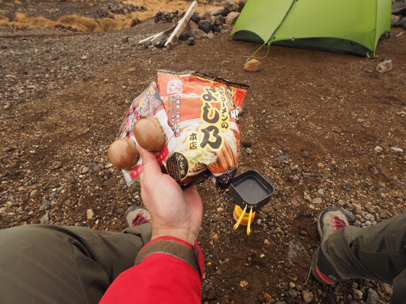 今日のご飯は旭川空港で買ったラーメンと味玉、更に味噌汁の具を入れます。この時期このキャンプ地は水が無いので自分で持って行った水を節約しながら過ごします。