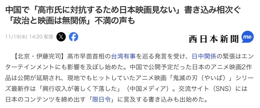 高市総理の発言がずっと尾を引いてますが、そんなに日本が嫌いで反日するなら日本のアニメや漫画も見なければ良いのに。