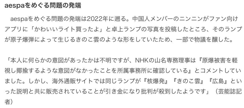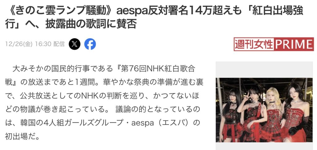 先日のニュースで紅白出場歌手のaespaのメンバーの過去投稿が問題で、「紅白に出すな、ふさわしくない」という署名が14万人くらい集まったと報道がありました。