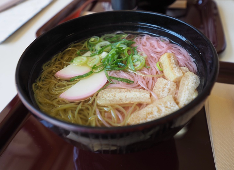 抹茶と紫蘇が練りこんであるにゅうめんです。そうめんの温かいのをにゅうめんっていうみたいですね〜。三輪そうめんのにゅうめんです。