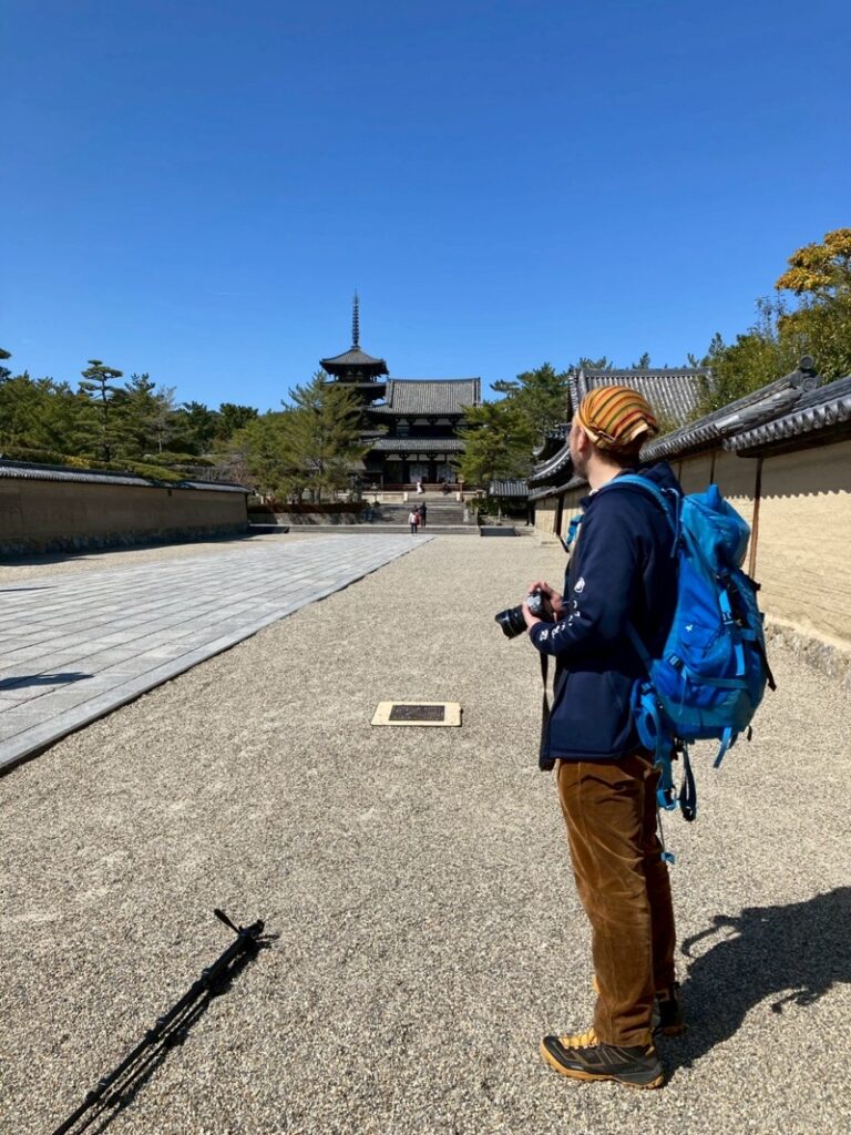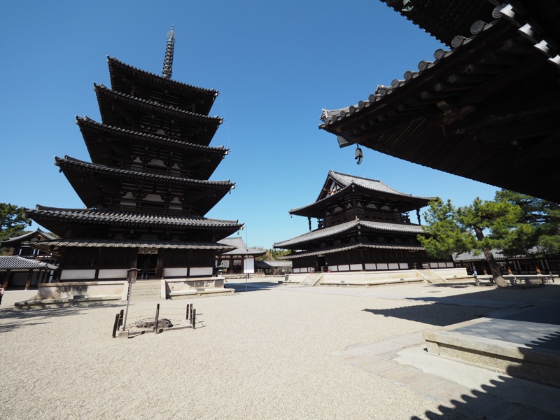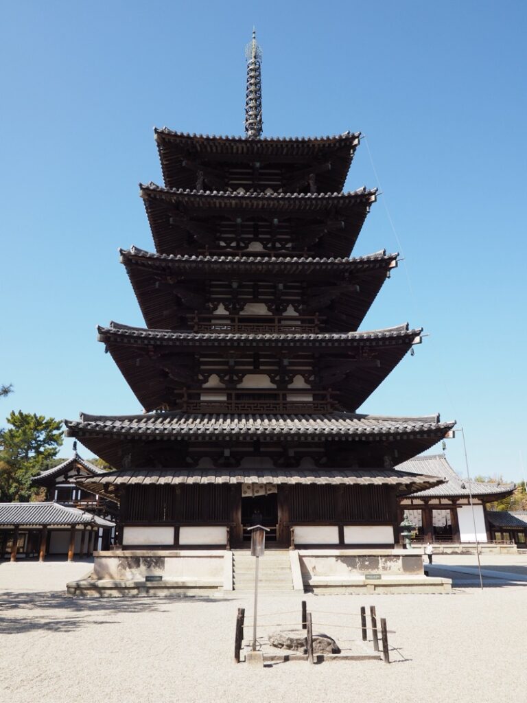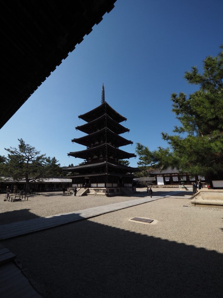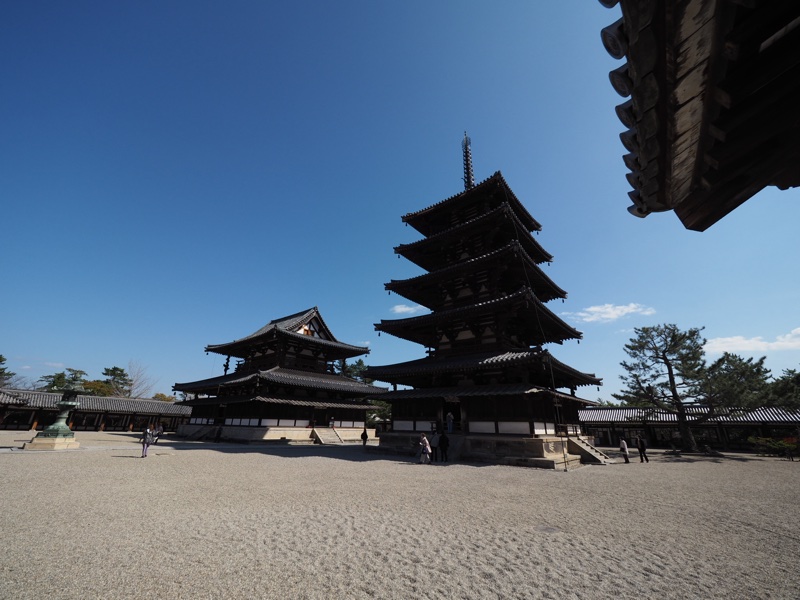 五重の塔すごい〜。日本最古の木造建築。ちなみに五重の塔は5階建じゃ無くて5層建て、中に一本の柱が通っていて吹き抜け構造なので5層一階建てなんですね〜。