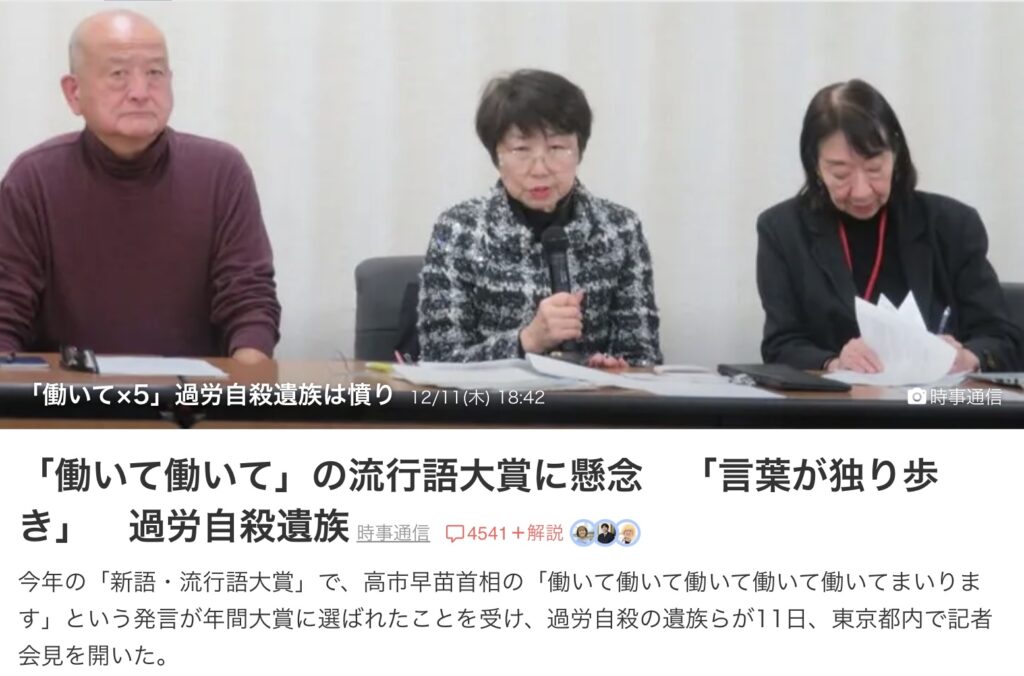 流行語対象が高市首相の「働いて✖️5」になりましたがそのニュースで過労自殺遺族が懸念を示しました。